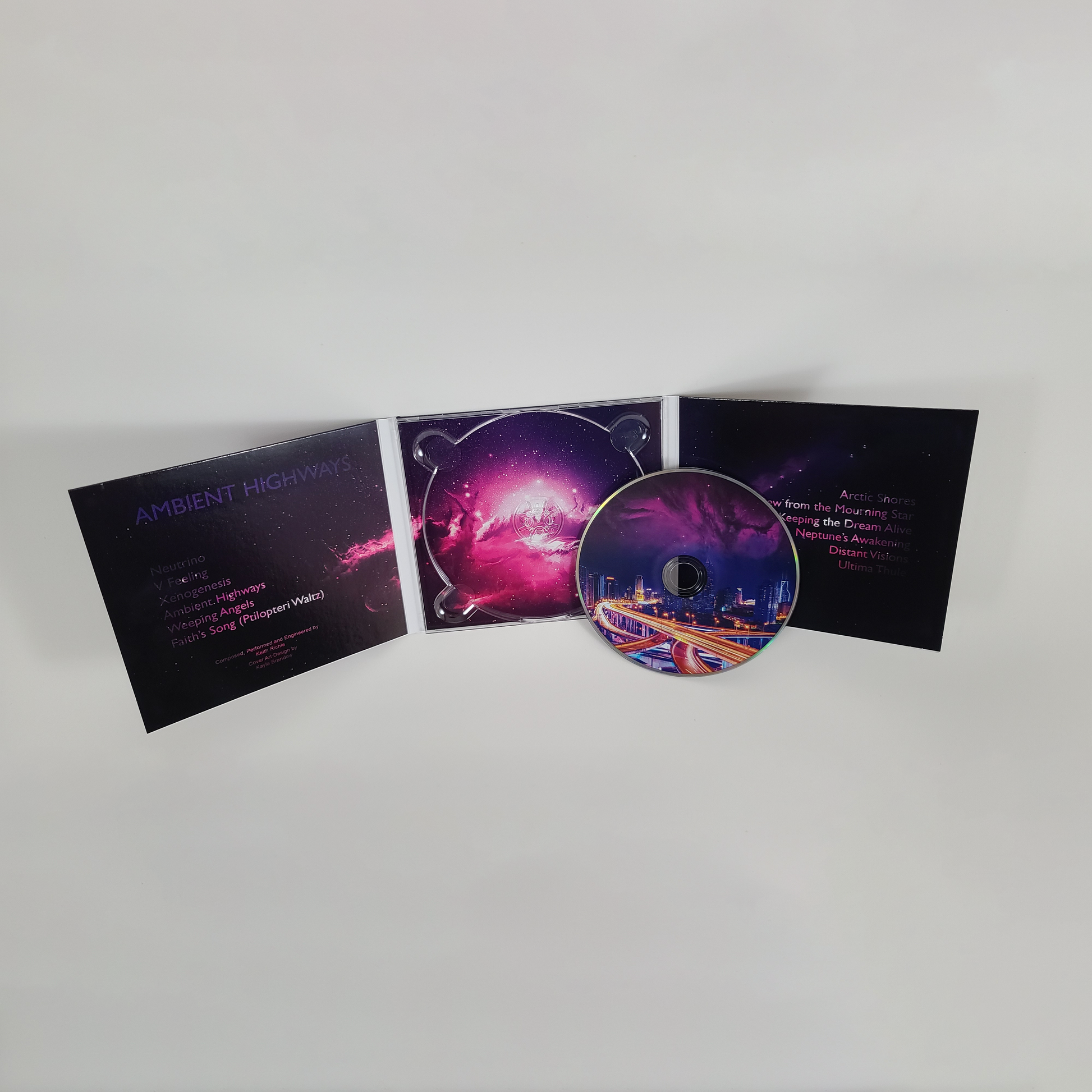 Experience Ambient Highways in a beautifully designed 3-panel digipak CD edition — a collector’s piece that pairs cosmic artwork with award-winning ambient soundscapes.